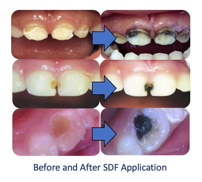 Silver diamine fluoride (SDF) is a liquid, topical antibiotic, which kills bacteria associated with tooth decay. SDF can harden an existing shallow surface cavity and may prevent it from becoming larger and deeper. SDF can also reduce tooth sensitivity associated with tooth decay.